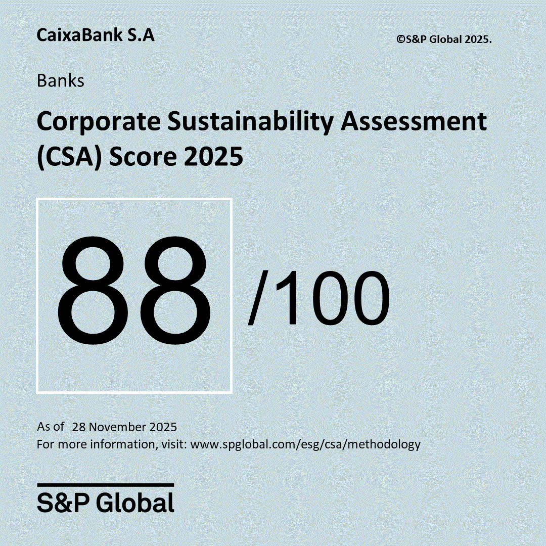In addition, in 2025 we have been included again in the A List of the CDP analyst, a global benchmark that classifies companies according to their carbon footprint management and climate impact. CaixaBank obtained the highest 'A' rating, placing it on the Climate Change A List 2025, for the twelfth consecutive year, within the Leadership category in management and transparency regarding climate change issues, recognising our outstanding performance in the management and measurement of the climate and environmental impacts of our activity.
