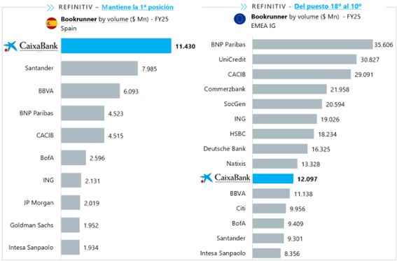 En l'àmbit del finançament corporatiu investment grade a EMEA (Europa, Orient Mitjà i Àfrica), CIB va registrar 12.097 milions de dòlars (10.280 milions d'euros), cosa que li va permetre escalar des del lloc 18è de 2024 fins al 10è el 2025 i ser la primera entitat espanyola classificada.