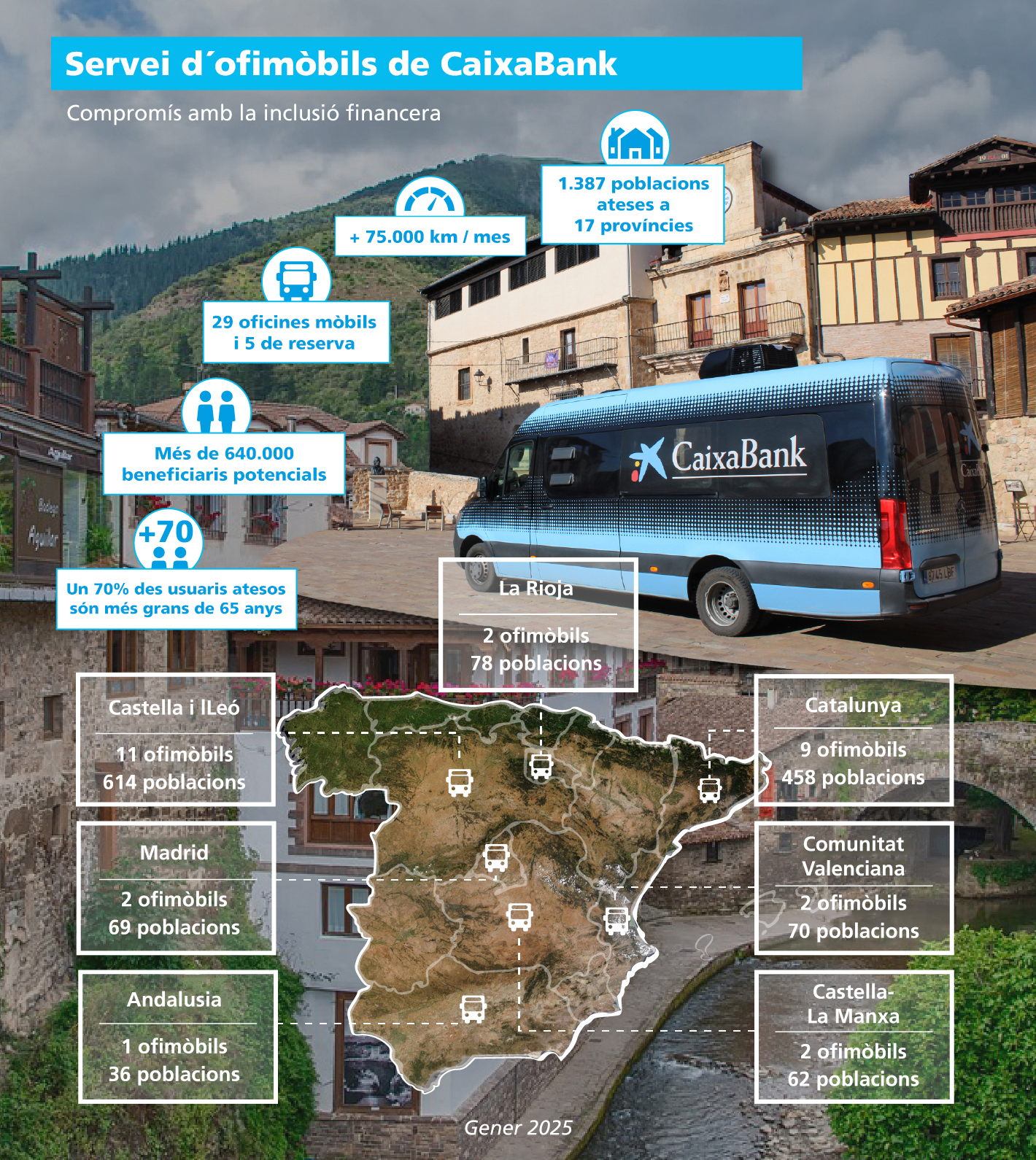 Nou oficines mòbils de CaixaBank recorren més de 18.000 quilòmetres al mes des del quart trimestre del 2024 per garantir l'accés a serveis financers en un total de 120 localitats de Barcelona en les quals viuen més de 117.000 persones; 119 poblacions de Lleida en les quals resideixen gairebé 42.000 habitants; 118 de Girona amb una població de més de 62.000 persones i 101 poblacions de Tarragona amb 66.000 habitants.
