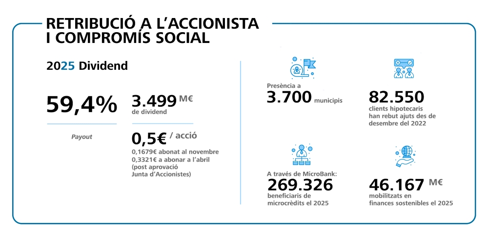 Amb aquest segon pagament, l’import total de la remuneració a l’accionista corresponent a l’exercici 2025 serà equivalent al 59,4% del benefici net consolidat (50 cèntims d’euro bruts per acció, un 15% més que en l’exercici anterior, i arribarà als 3.499 milions d’euros), després que el novembre passat es va abonar el dividend a compte per un import de 1.179 milions d’euros (16,79 cèntims d’euro bruts per acció). D’aquest total de retribució a l’accionista, al voltant del 50% reverteix directament en la societat, ja que el reben la Fundació ”la Caixa” i el FROB.