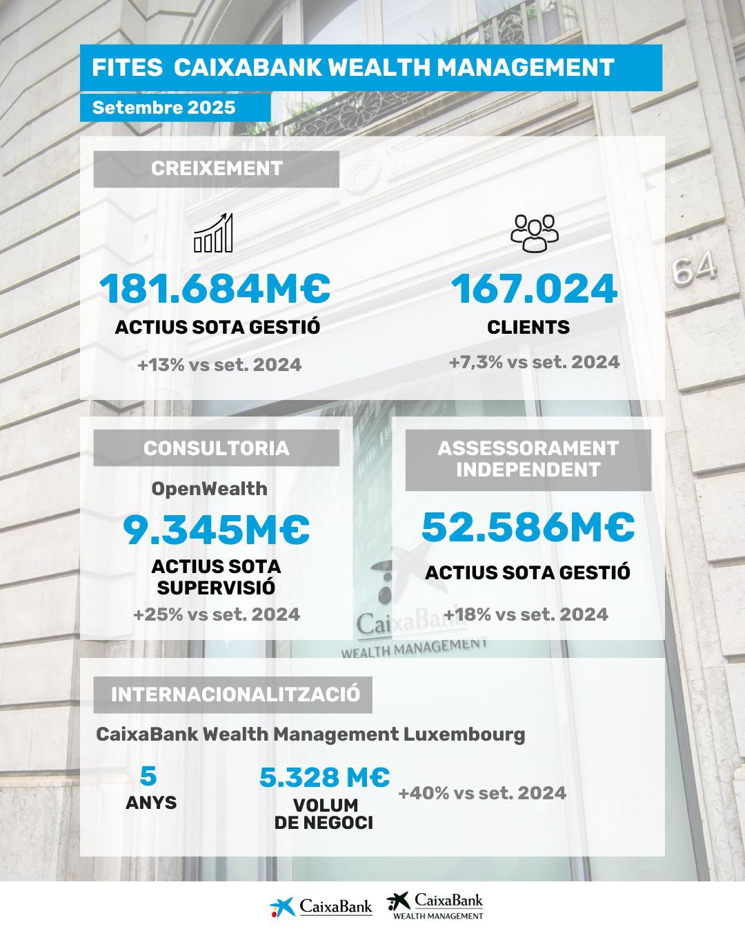 En el primer any del nou Pla Estratègic 2025-2027 de CaixaBank, CaixaBank Wealth Management ha registrat un creixement destacat en actius sota gestió a Espanya (181.684 milions d’euros a tancament de setembre de 2025, cosa que suposa un 13% més respecte a setembre de 2024), així com també en clients (167.024, +7,3%) i en gestors (1.142, +4%).