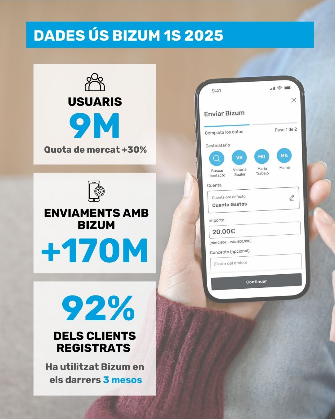 Durant els sis primers mesos de l'any, els clients de CaixaBank van efectuar més de 170,4 milions d'enviaments amb Bizum, la qual cosa representa una mitjana de prop d'un milió d'operacions diàries. A això se sumen gairebé 5 milions de compres online, la qual cosa suposa un increment del 70% respecte al mateix període de l'any anterior, reflex d'una adopció creixent del servei en el comerç electrònic.