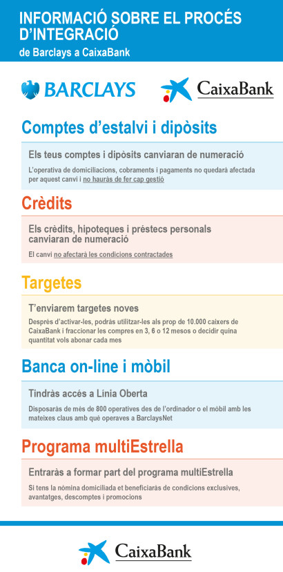 A partir d’aquest cap de setmana es farà efectiva la integració de Barclays Bank SAU a CaixaBank, un procés que es va iniciar el 31 d’agost passat amb l’anunci de l’acord entre CaixaBank i Barclays Bank, PLC per adquirir el negoci de banca minorista, gestió de patrimonis i banca corporativa de Barclays a Espanya.