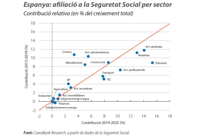 Si ens centrem en el període més recent, els sectors més dinàmics en termes de creació d'ocupació pertanyen tant a l'àmbit públic (educació i sanitat) com al tecnològic privat (TIC) i el de serveis especialitzats (activitats professionals), i la seva evolució combinada ha aconseguit compensar, en bona mesura encara que no del tot, l'efecte desfavorable de la pèrdua d'ocupació en sectors tradicionalment productius com la indústria i les finances.