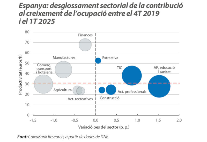 L'evidència mostra que el patró sectorial de creació d'ocupació des del 2019 ha estat lleugerament més benigne per a la productivitat que el del cicle 2013-2019, i molt superior al de l'expansió dels 2000. Això no significa que la productivitat estigui creixent ràpidament –els seus avenços continuen sent modestos, al voltant del 0,5% anual de mitjana–, sinó que almenys la distribució de nous llocs de treball no està llastant la productivitat mitjana, com sí que va ocórrer en el passat.