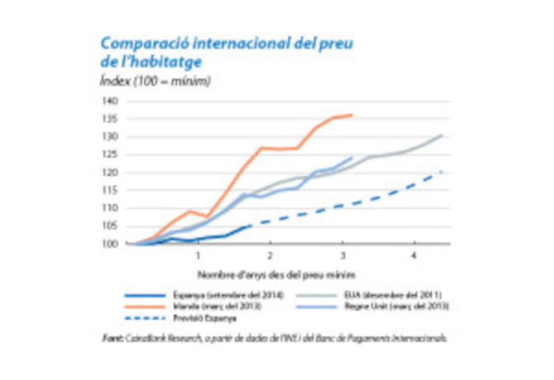 Aquesta recuperació continuarà a l’alça segons les estimacions de CaixaBank Research. En concret es preveu que el creixement del preu de l’habitatge rondi el 3% aquest any i que vagi en augment fins a assolir el 5,5% el 2018. Encara que potser sembli una previsió optimista, és un creixement moderat si es compara amb l’evolució que s’ha experimentat en països que també han patit una severa correcció recentment, com és el cas d’Irlanda, els EUA i el Regne Unit.