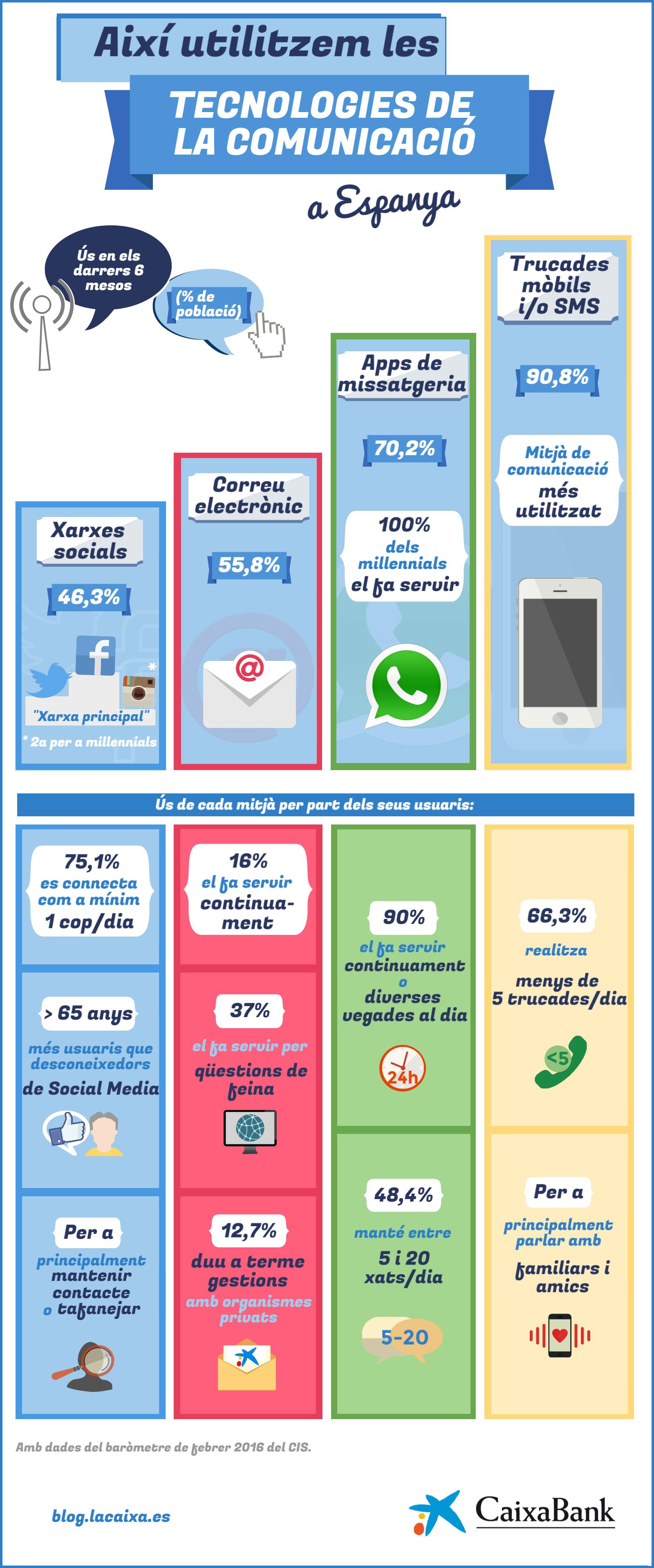 L’últim baròmetre del Centre d’Investigacions Sociològiques (CIS), corresponent al mes de febrer de 2016, ha confirmat el que era un secret de domini públic. Mòbil, xarxes socials i serveis de missatgeria instantània formen part de l’ADN dels espanyols, tant per a ús personal com per relacionar-se amb les empreses. Aquests són els aspectes més destacables de l’estudi: