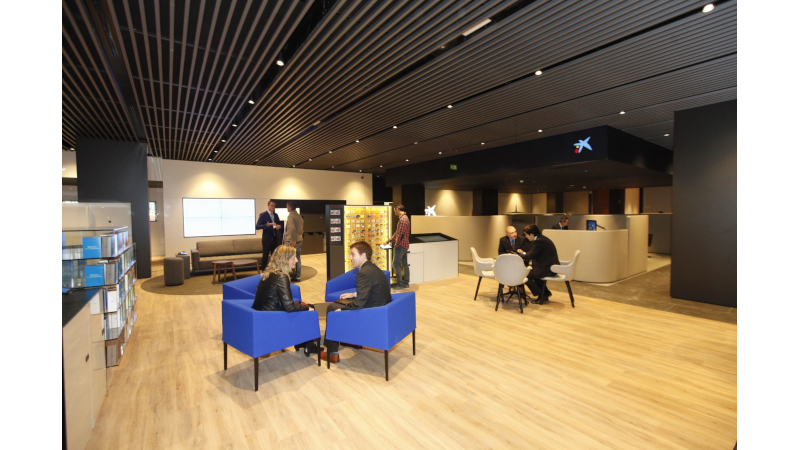En traspassar l'àmplia façana de l'oficina, trobem un espai diferent, obert, flexible, innovador. La zona de caixers ens condueix a una zona central d'envergadura. Taules baixes amb butaques àmplies apuntalen un espai en què els tons blancs, grisos i negres contrasten entre si i s'esquitxen amb els esclats blaus característics de CaixaBank.