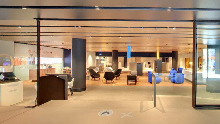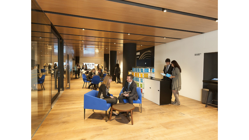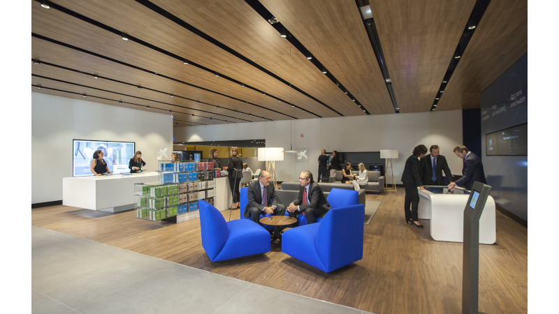 Clients i visitants poden seure en confortables butaques o descobrir els diferents productes i serveis a través de plataformes interactives. Proximitat i mobilitat al servei del client. Per moments, sembla com si no fóssim en una oficina bancària: si girem la vista cap a un costat, trobem una exposició física de productes que es van renovant periòdicament.