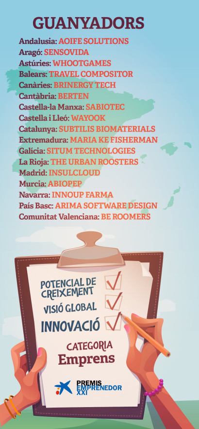 17 empreses amb potencial de creixement ubicades cada una a les 17 comunitats autònomes amb dos eixos en comú: l’emprenedoria i la innovació. Són les guanyadores de la novena edició dels Premis EmprenedorXXI en la categoria Emprens, el guardó referent per a start-ups i el més ben dotat econòmicament d’Espanya.