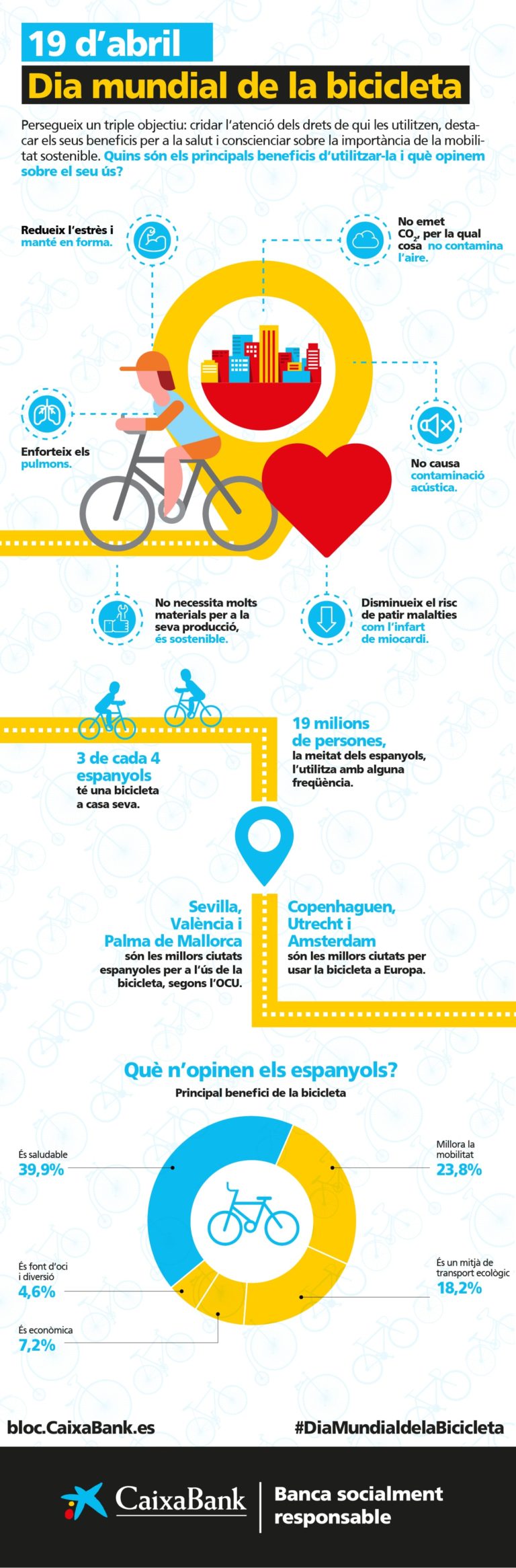 Durant el Dia Mundial de la Bicicleta, més enllà de promoure'n l'ús, es persegueix un triple objectiu: cridar l'atenció sobre els drets de qui la utilitza, destacar-ne els beneficis per a la salut i conscienciar sobre la importància de la mobilitat sostenible. I és que, d'una banda, l'ús de la bicicleta és una forma ideal d'introduir l'exercici en el dia a dia. No només ens ajuda a posar-nos en forma, sinó que a més redueix l'estrès, enforteix els pulmons i pot disminuir diversos riscos, com el de patir un infart de miocardi.