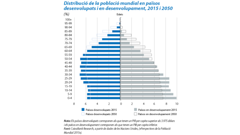 El primer és l’envelliment de la població. A Espanya hi ha uns 8 milions de majors de 65 anys, cosa que representa un 17,5% de la població total, però, segons les previsions, el 2050 aquest nombre ascendirà fins a sobrepassar els 16 milions de persones. Per contra, per a aquestes dates, els menors de 65 sumaran uns 27 milions de la població total (respecte als 38 que representen actualment). A més, a aquest envelliment de la població l’acompanyen altres factors com la baixa taxa de natalitat (de l’1,5% el 2050), lluny del 2,1% necessari per garantir el reemplaçament generacional, i el creixement progressiu de l’esperança de vida (el 2050 es preveu que serà de 84,4 i 89,1 anys en homes i dones, respectivament).