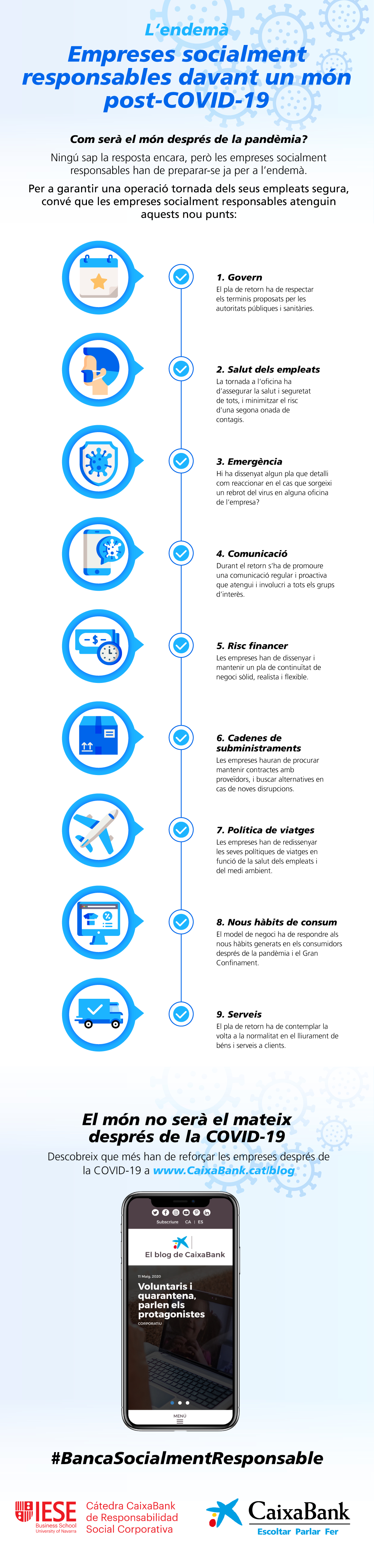 Per facilitar aquesta «operació tornada» a les companyies, la Càtedra CaixaBank de Responsabilitat Social Corporativa (RSC) de l'IESE ha publicat el quadern «L'endemà: empreses socialment responsables davant un món postCOVID-19». Elaborat per Philip Muller i Joan Fontrodona, aquest informe proposa tenir en compte l'RSC com a guia, explica com s'han d'adaptar les empreses a un entorn canviant i ofereix algunes claus per comprovar que la tornada a la feina és segura per a tothom.