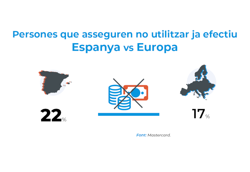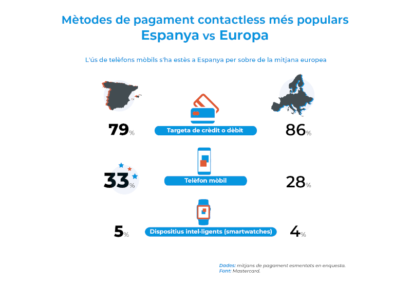 Tant és així que, segons un estudi de Mastercard, el 22% de les persones que enquestades a Espanya afirma que ja no fa servir diners en efectiu. Per part seva, tres de cada cinc participants en l'enquesta diuen que el pagament contactless és el seu mètode preferit per abonar les seves compres.