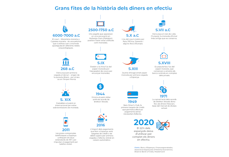 Davant d'aquest panorama futurista, és normal que sorgeixin algunes preguntes. Per exemple, com hem arribat fins aquí? Com hem passat de l'intercanvi de petites petxines en la prehistòria al pagament contactless de l'actualitat? En realitat, aquesta és una història d'adaptació. Les transaccions que requereixen màxima liquiditat sempre han trobat un mitjà de pagament adequat a les circumstàncies de cada època.