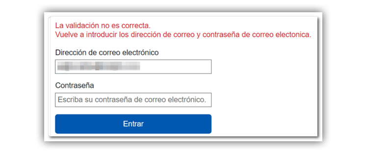 Quan s'introdueix el correu electrònic i la contrasenya, sempre apareix el següent: «La validació no és correcta. Torna a introduir l'adreça de correu i contrasenya de correu electonic».