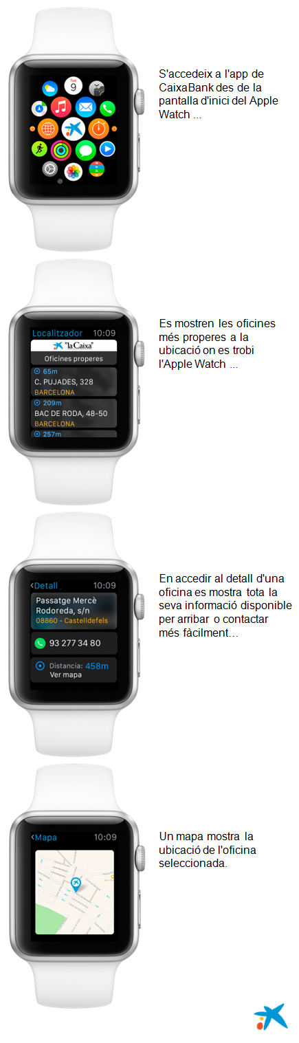 Es tracta d’un cercador d’oficines i caixers. Els clients ja poden veure des de seu smartwatch d’Apple la ubicació exacta de les oficines i caixers més propers, incloent la localització sobre mapes per fer més fàcil trobar el lloc exacte.