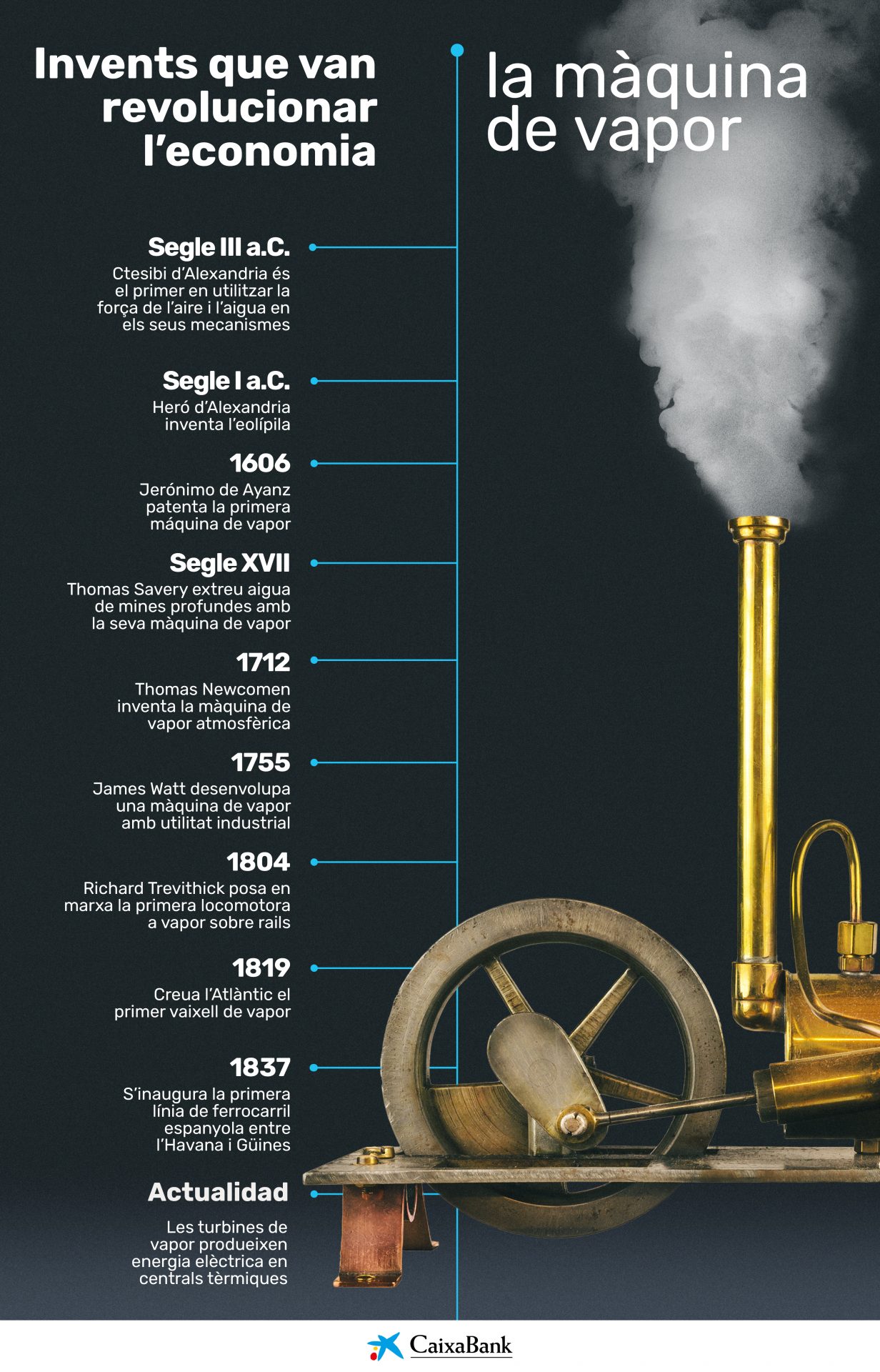 Aquest enginy va transformar l'estructura econòmica i social de la civilització industrial. La producció en massa de béns de consum, la construcció i el transport van canviar per sempre. Ho van fer moguts per una màquina amb la qual ja se somiava en la Grècia del segle I.