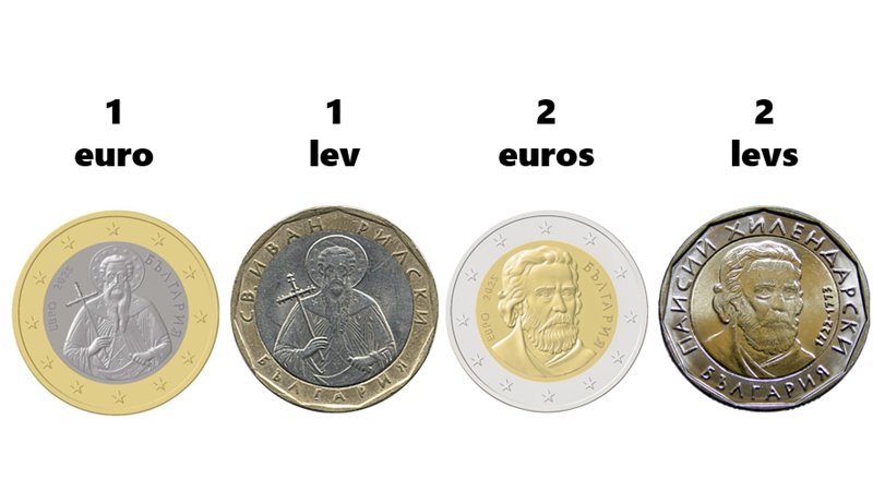 El Consell de la UE ha fixat el tipus de conversió per al lev, la moneda búlgara, d'1 euro=1,95583 lev. Arrodonint, 2 levs per un euro. Amb l'entrada de Bulgària, l'alfabet ciríl·lic se suma al llatí i al grec en les monedes d'euro i apareixerà en l'anvers de les monedes búlgares.
