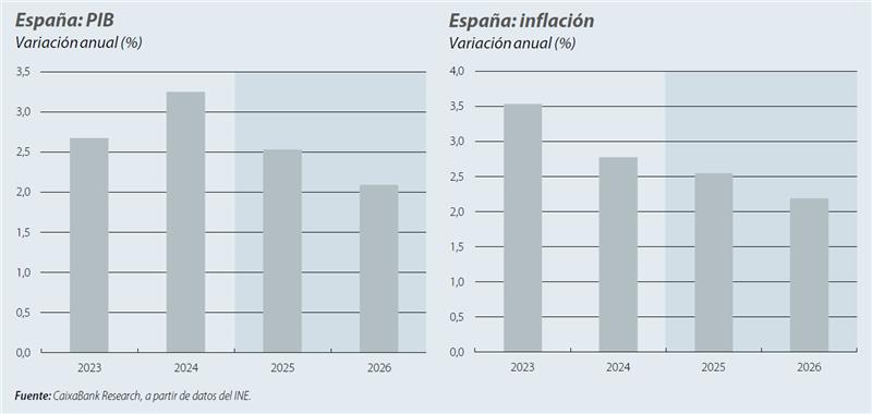 No obstant això, esperem que el creixement es moderi respecte a l'any passat, a mesura que alguns dels vents de cua dels quals s'ha beneficiat la nostra economia en els últims trimestres perdin força. En particular, destaquem la normalització del ritme de creixement del sector turístic i una certa moderació dels influxos de població previstos. Així mateix, la sostinguda debilitat de l'economia europea, la previsió de creixement de la qual per a 2025 es manté per sota de l'1%, juntament amb el possible augment dels aranzels entre els EUA i la UE afectaran negativament la nostra economia.