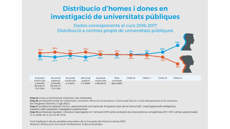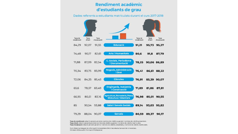 De fet, segons les últimes dades de la Secretaria General d'Universitats, mentre que elles estan sobrerepresentades en els estudis de grau de Ciències de la Salut (70%), amb prou feines suposen un de cada quatre alumnes en carreres tecnològiques (Enginyeria i Arquitectura).Igual que en el cas de les nenes, els resultats acadèmics d'aquelles dones que s'animen a fer una carrera científica o tecnològica demostren que els estereotips de gènere són només això, mers estereotips. I així ho corrobora el fet que tant el seu rendiment durant els estudis com la seva nota mitjana en acabar-los són lleugerament superiors als dels nois, tal com revelen les dades oficials