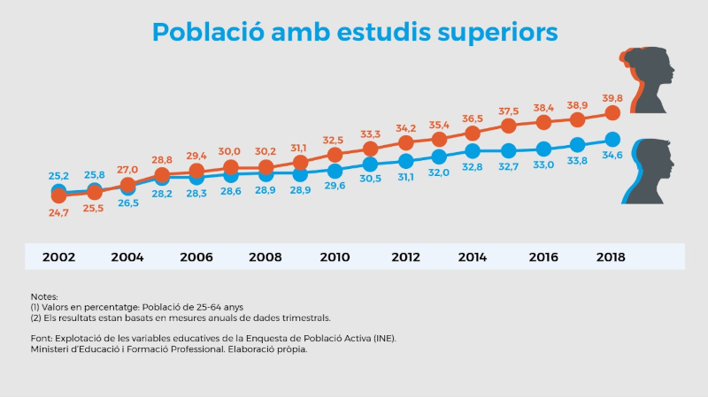 Malgrat aquesta bretxa, hi ha uns altres indicadors que mostren el gran avenç que ha experimentat l'educació de les dones en els darrers anys i que, al seu torn, evidencien que tan sols és qüestió de temps que s'estengui també a uns altres àmbits. Per exemple, el fet que la proporció de població amb estudis superiors hagi variat la seva tendència des del 2002, quan existia un percentatge més alt d'homes que no pas de dones en aquesta situació. Avui, tanmateix, la quota d'adults amb educació superior ha augmentat i el percentatge de dones en aquesta situació supera fins i tot el dels homes.
