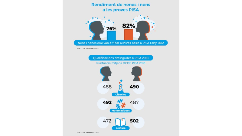En consonància amb aquestes troballes, un informe de l'OCDE explica com, fins als sis anys, les nenes es veuen iguals que els nens, però a partir d'aquesta edat comencen a associar brillantor amb masculinitat i la seva ansietat davant matèries com ara les matemàtiques augmenta.Així, doncs, els biaixos de gènere en la nostra visió de la ciència comencen en la infància. Tanmateix, les qualificacions que obtenen nens i nenes no justifiquen aquesta distorsió. Ans al contrari: el 2012, el 81% de les estudiants analitzades va assolir el nivell bàsic establert per l'OCDE en el seu informe PISA per a lectura, ciències i matemàtiques, enfront del 76% dels seus companys homes. A més, l'última edició de PISA amb prou feines detecta diferències en el rendiment entre tots dos gènere en ciències i matemàtiques. Sí que ho fa en lectura, i és a favor de les nenes.