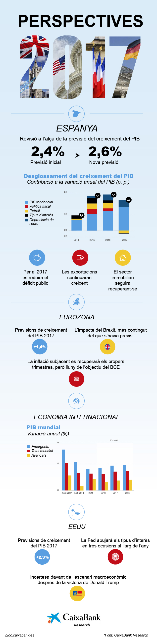 Així ho revela l'Informe Mensual de CaixaBank Research ‘Perspectives 2017’: L'any 2017, Espanya creixerà un 2,6% i superarà el PIB precrisi que tenia l'any 2008. A més, l'estudi augura que el creixement del PIB es podria mantenir per sobre del 3%, encara que tot dependrà de l'evolució del preu del petroli, de la política monetària i de si el dèficit acaba sent més favorable del que es preveu.