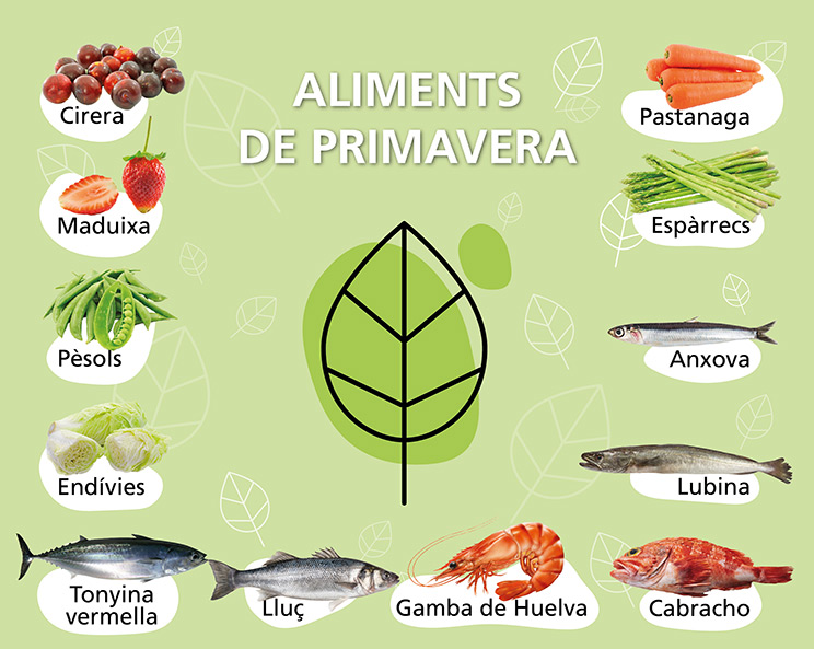A l'abril fan acte de presència pèsols, endívies o pastanagues i, cap a final de temporada, arriben les maduixes i algunes fruites d'os, com les cireres.