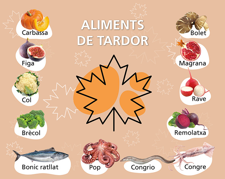 Descarregar JPG 0.1 MBLa caiguda de les fulles sol venir acompanyada d'unes vistoses cucurbitàcies als horts, les carbasses, que entren en la seva època de més esplendor. Mentrestant, els boscos s'omplen de bolets. Magranes i figues són visitants fugaços el setembre i l'octubre és un mes molt bo pel rave, la remolatxa, les cols i el bròquil. Al novembre, ja comencen a fer acte de presència els cítrics.