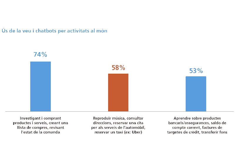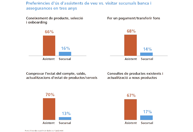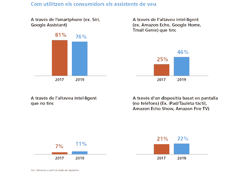 Aquesta polivalència dels assistents de veu explica en bona mesura per què aquests dispositius tenen —i tindran— un espai cada vegada més gran en les preferències dels usuaris. La possibilitat d'expressar una ordre i que el dispositiu no només ens entengui a la perfecció sinó que, a més, l'executi, ja està transformant el dia a dia de moltes persones al nostre país. Segons l'Informe ditrendia Mobile a Espanya i al Món 2020, fins al 70% dels espanyols ja utilitzen assistents virtuals de veu, l'equivalent a 4,3 milions de llars.Aquesta tendència d'usar la veu en lloc del teclat s'observa a tot el món. El creixement de la preferència de l'ús de la veu a nivell global és tal que l'informe preveu que el 70% dels consumidors reemplaçaran les seves visites a oficines bancàries pels seus assistents de veu en els propers tres anys per a operacions com comprovar l'estat del compte, el seu saldo o actualitzar l'estat de productes i serveis. De fet, el 53% dels consumidors a tot el món ja els han utilitzat alguna vegada per accedir als seus productes bancaris o d'assegurances.
