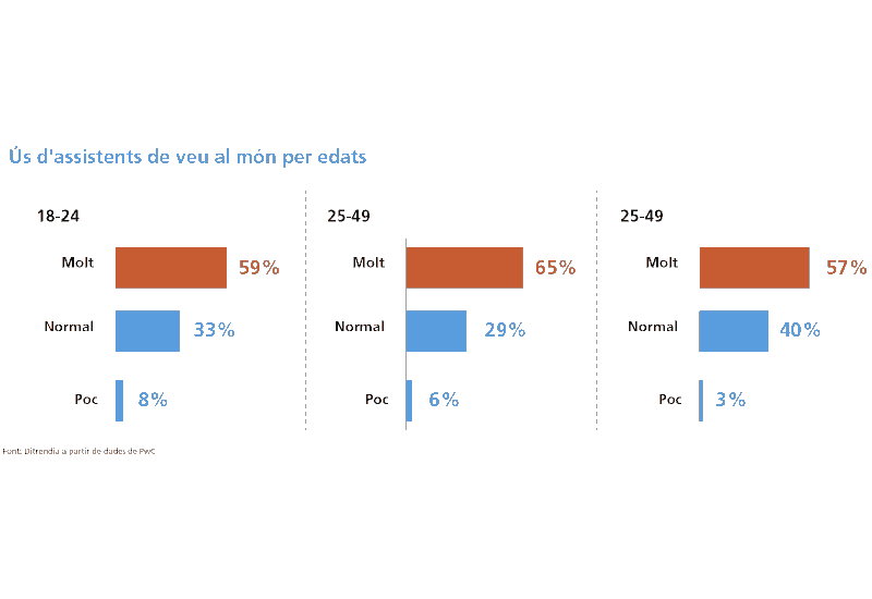 Encara que pugui semblar un avenç punter que només interessa als més joves, és cert que les persones de 25 a 49 anys són les que utilitzen els assistents de veu amb més freqüència. Per la seva banda, només el 3% de les de més de 50 anys declaren utilitzar-los poc.