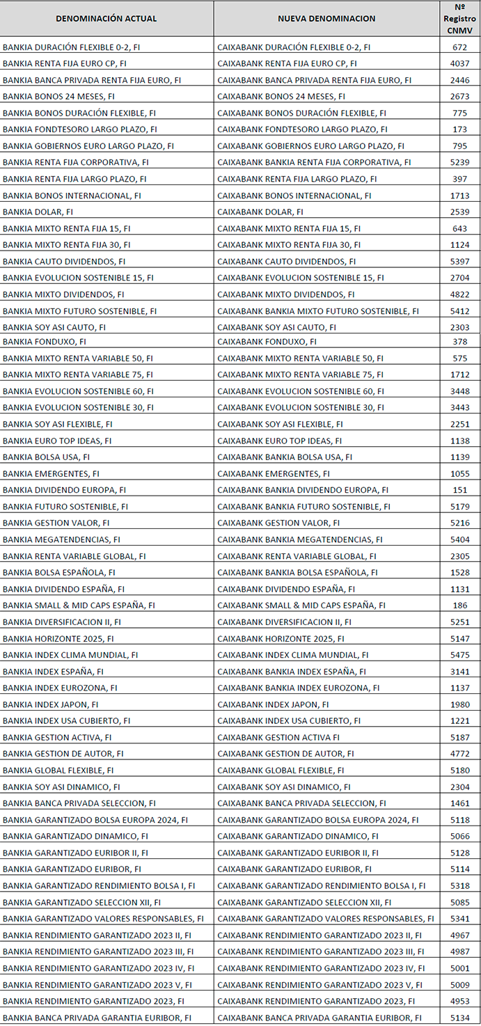 CaixaBank AM has requested the CNMV to change the names of the investment funds acquired from Bankia to reflect that they are owned by the CaixaBank Group. The investment funds will include CaixaBank in their name. Bankia funds that had a same or similar name as CaixaBank funds will now be temporarily changed to “CaixaBank Bankia”, so they are easily identifiable (see appendix).
