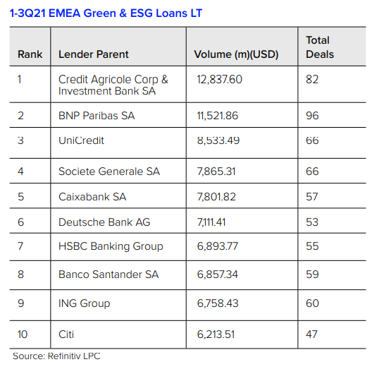 Refinitiv Ranking —EMEA green and sustainable Loans (includes Spain)— 3rd quarter 2021
