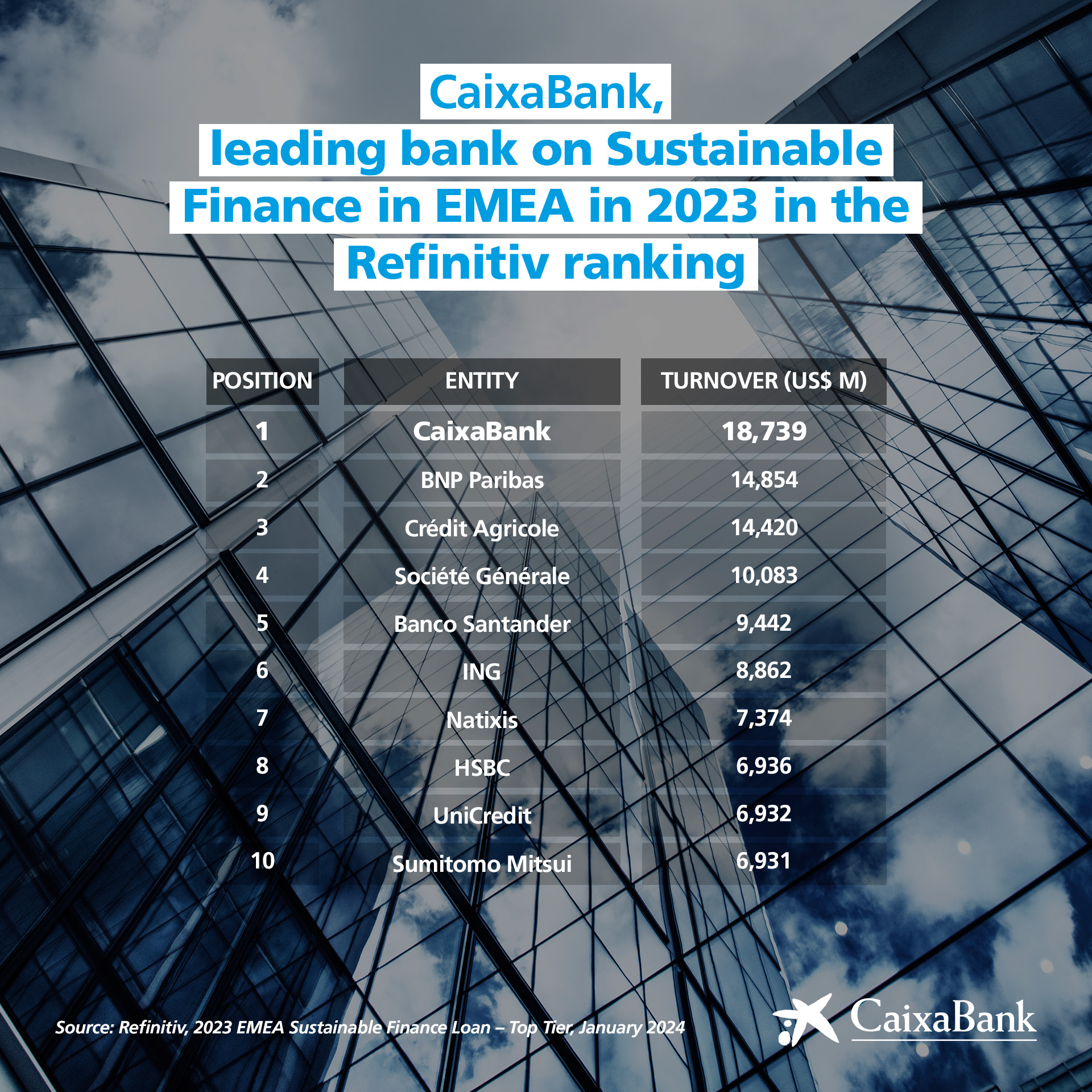 CaixaBank also finished the 2023 Refinitiv LSEG world ranking in sixth place, its best position ever, and is the only Spanish bank to appear in the top ten. To reach this position, Refinitiv LSEG has posted 126 financing transactions, reaching a total of US$19.19 billion.