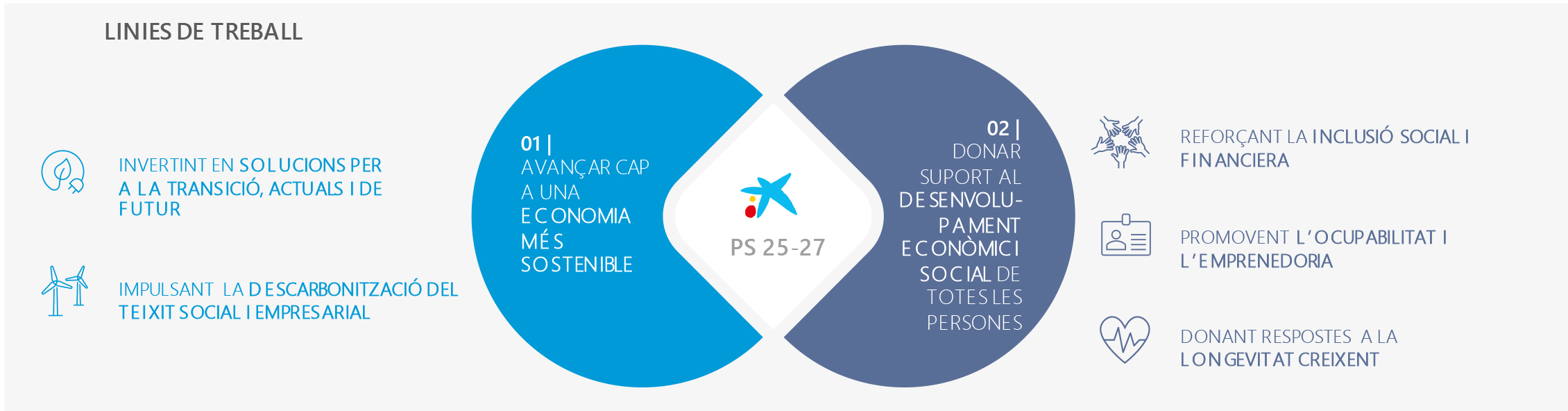 CaixaBank presenta el nou Pla de Sostenibilitat 2025-2027, peça clau del nou Pla Estratègic del Grup i alineat amb els seus pilars fonamentals de creixement, transformació i recolzament a clients i la societat. D'aquesta manera, CaixaBank reforça la seva aposta per la sostenibilitat i la continua integrant de manera transversal en l'estratègia i decisions de totes les empreses del Grup, per posar a disposició de les persones un servei proper amb el client i que, alhora, generi un impacte positiu en el negoci, en les empreses i en la societat.