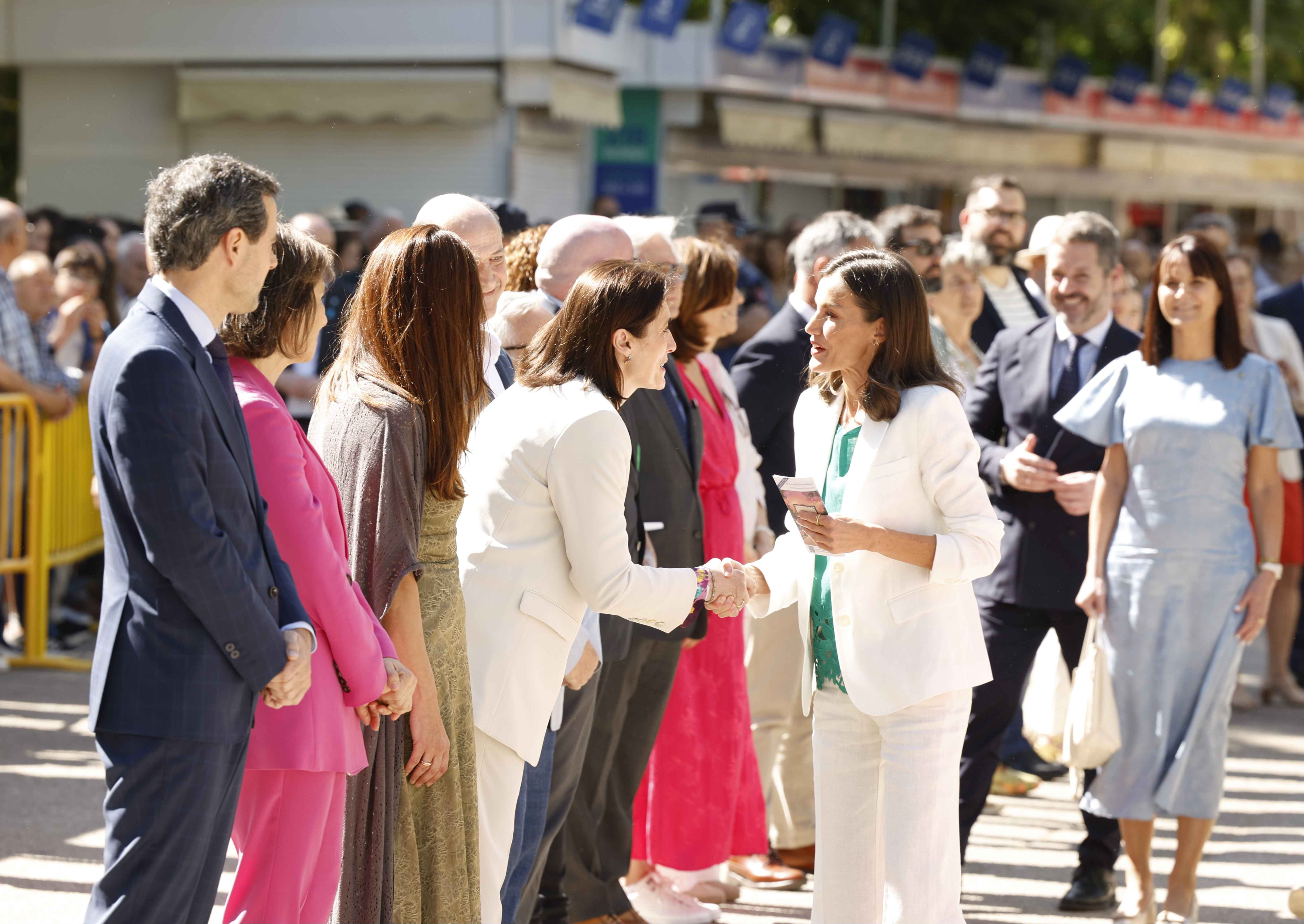 El ministro de Cultura, Ernest Urtasun; la directora de la Feria del Libro de Madrid, Eva Orúe; y S.M. la Reina Letizia a su paso por el Pabellón CaixaBank de la 83ª Feria del Libro de Madrid.