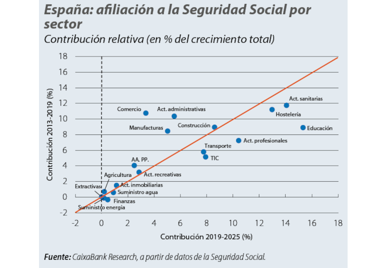 ¿Cuál es contribución al crecimiento de la afiliación a la Seguridad Social de cada sector en dos periodos? Tras la pandemia, España ha estado creando relativamente más puestos de trabajo en servicios públicos (educación y sanidad), sectores tecnológicos y de servicios profesionales, en contraste con el ciclo anterior, donde tuvieron mayor peso el comercio, la industria manufacturera y otros servicios empresariales tradicionales (actividades administrativas), tal como se recoge en el Informe Mensual de CaixaBank Research