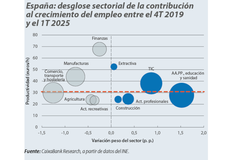 La evidencia muestra que el patrón sectorial de creación de empleo desde 2019 ha sido ligeramente más benigno para la productividad que el del ciclo 2013-2019, y muy superior al de la expansión de los 2000. Esto no significa que la productividad esté creciendo rápidamente –sus avances siguen siendo modestos, en torno al 0,5% anual en promedio–, sino que al menos la distribución de nuevos empleos no está lastrando la productividad media, como sí ocurrió en el pasado.