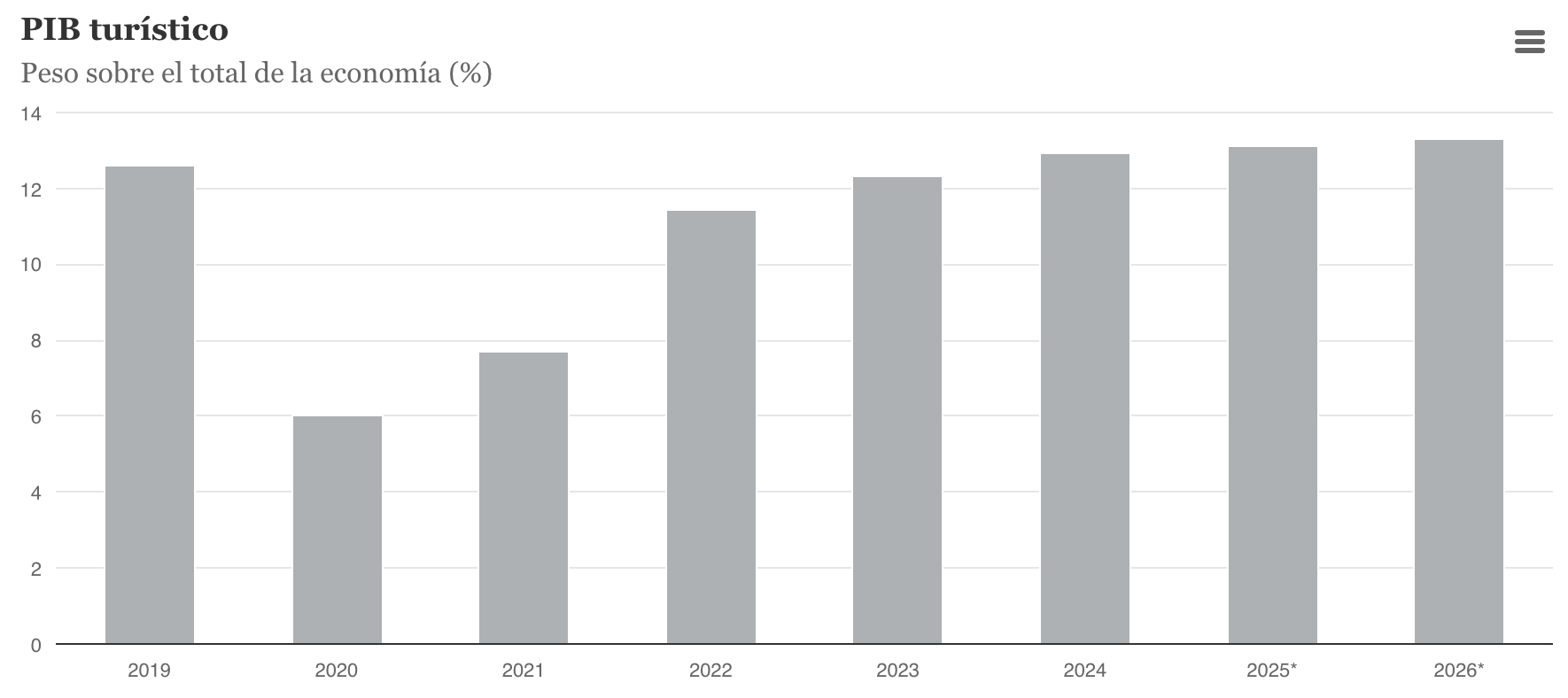 De estos datos podemos extraer una conclusión clara: tras la fuerte aceleración postpandemia, claramente anómala por las restricciones de años previos, el sector turístico español está experimentando un crecimiento más sostenible. Dicha sostenibilidad se evidencia también en otro dato: el peso del sector dentro de la economía española. Como vemos en el gráfico inferior, desde 2020, la representatividad del PIB turístico respecto al total de la economía no ha hecho más que crecer. De hecho, la de 2025 (13,1%) será incluso superior a la de 2019 (12,6%).