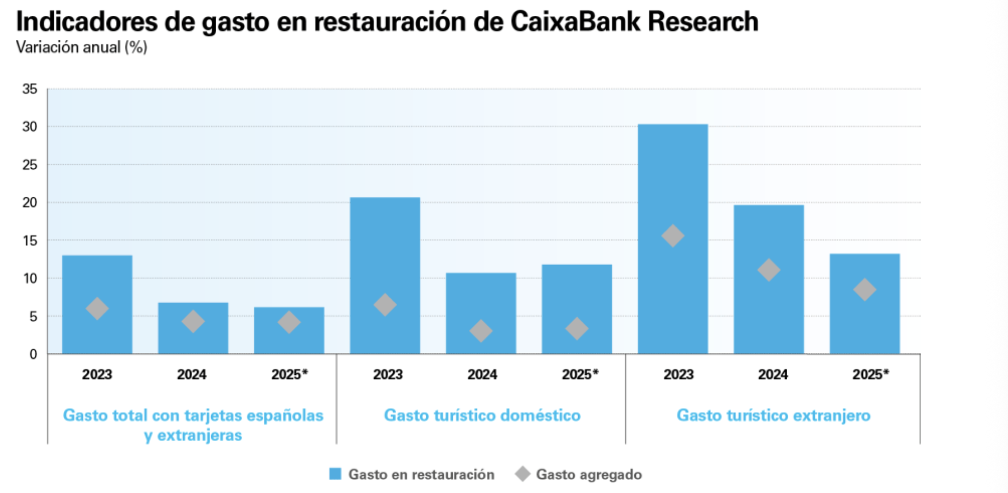 El indicador de gasto en restauración de CaixaBank Research muestra una tendencia muy similar: entre enero y mayo de este año, los pagos presenciales y electrónicos con tarjetas españolas y extranjeras aumentaron un 6,4%. Esta cifra, por cierto, se sitúa dos puntos porcentuales por encima del consumo total en nuestro país.