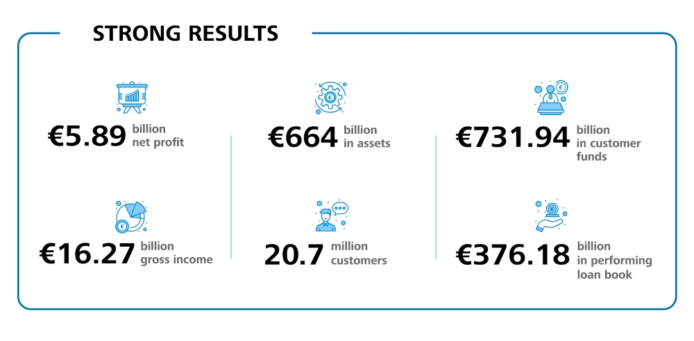 Gross income (i.e. total income) closed the year at €16.27 billion, up 2.5% year-on-year, while administrative expenses, depreciation and amortisation increased by 5% to €6.42 billion. As a result, pre-impairment income reached €9.86 billion, up 0.9% in the year.