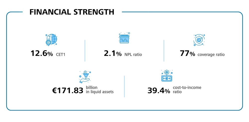 On the liquidity front, total liquid assets stood at €171.83 billion, while the Group’s Liquidity Coverage Ratio (LCR) was 202%, demonstrating a comfortable liquidity position and well above the minimum regulatory requirement of 100%.