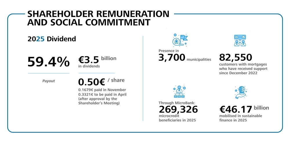 Including this second payment, total shareholder remuneration for 2025 will amount to 59.4% of consolidated net profit (€0.50 gross per share, up 15% year-on-year), for a total of €3.5 billion, following the interim dividend paid last November, amounting to €1.18 billion (€0.1679 gross per share). Around 50% of total shareholder remuneration ultimately benefits society directly, as it is received by ”la Caixa” Foundation and the FROB.