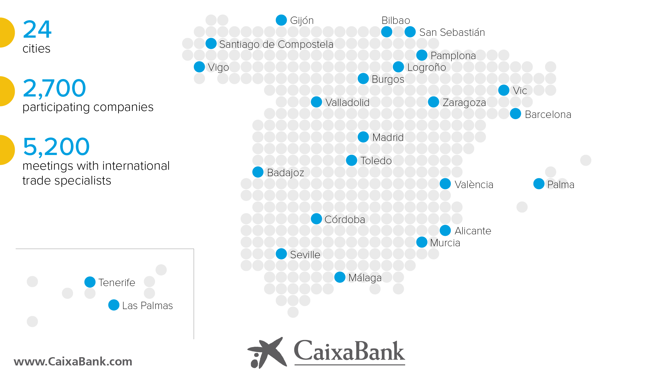 Since 2008, more than 2,700 companies have taken part in the Puertas al Exterior events. There have been over 5,200 meetings with CaixaBank international trade specialists. The bank has run this initiative in 24 cities, in all of the Autonomous Communities of Spain.