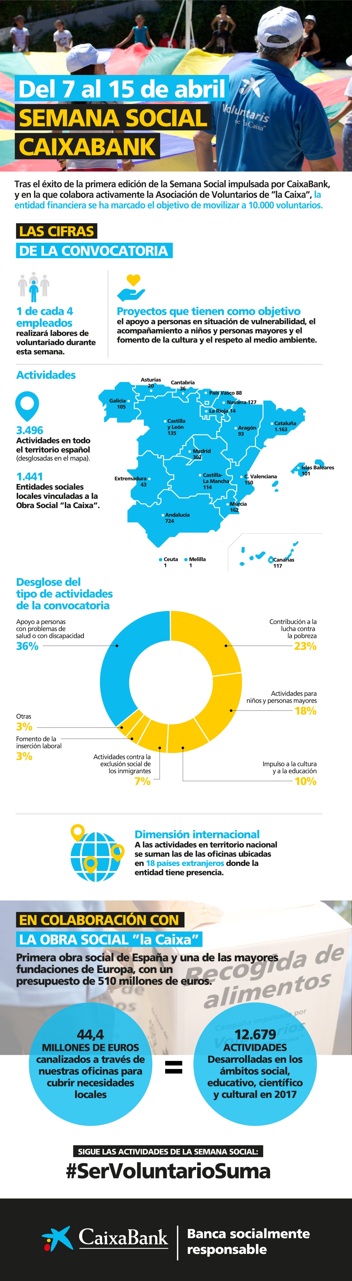 La Semana Social se llevará a cabo entre los días 7 y 15 de abril en toda España. Durante estos nueve días, uno de cada cuatro empleados de CaixaBank, la Fundación Bancaria ”la Caixa”, CriteriaCaixa y filiales participarán, de forma voluntaria, en algunas de las 3.500 actividades que unas 1.500 entidades sociales locales han puesto a su disposición en todas las provincias de España. Asimismo, como novedad para esta edición, los empleados podrán invitar a clientes para que les acompañen y participen en alguna de las actividades voluntarias que se realizan gracias a la ayuda de la Obra Social “la Caixa”.