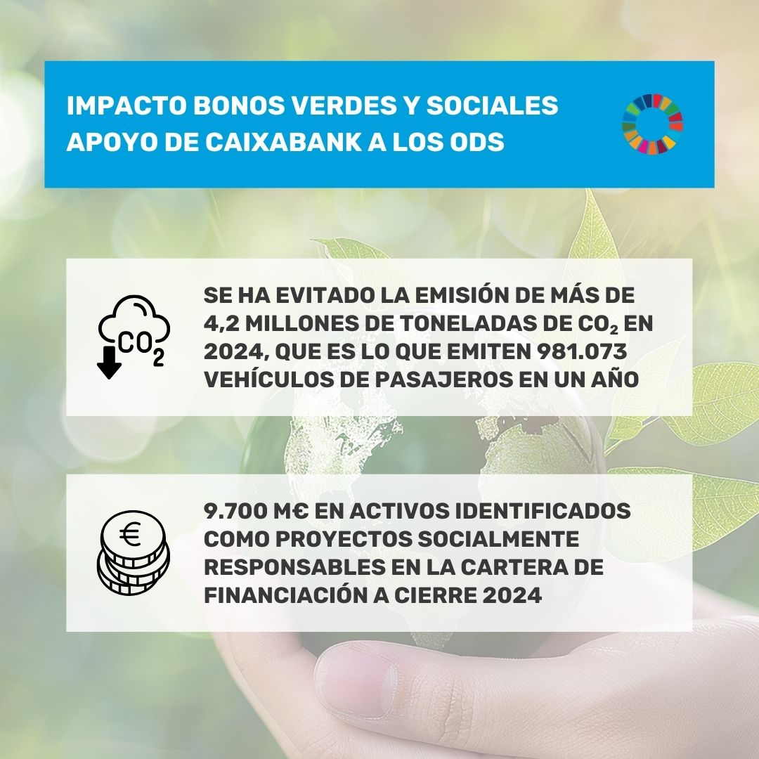 CaixaBank ha logrado evitar la emisión de más de 4,2 millones de toneladas de CO2 en 2024 con los fondos captados a través de la emisión de bonos verdes, una de las piezas de la estrategia de la entidad para luchar contra el cambio climático y contribuir a la transición hacia una economía neutra en carbono, tal y como se refleja en su informe Green Bonds Report , que ve la luz coincidiendo con la celebración del 10 aniversario de la aprobación de la Agenda 2030 y de los 17 Objetivos de Desarrollo Sostenible (ODS).