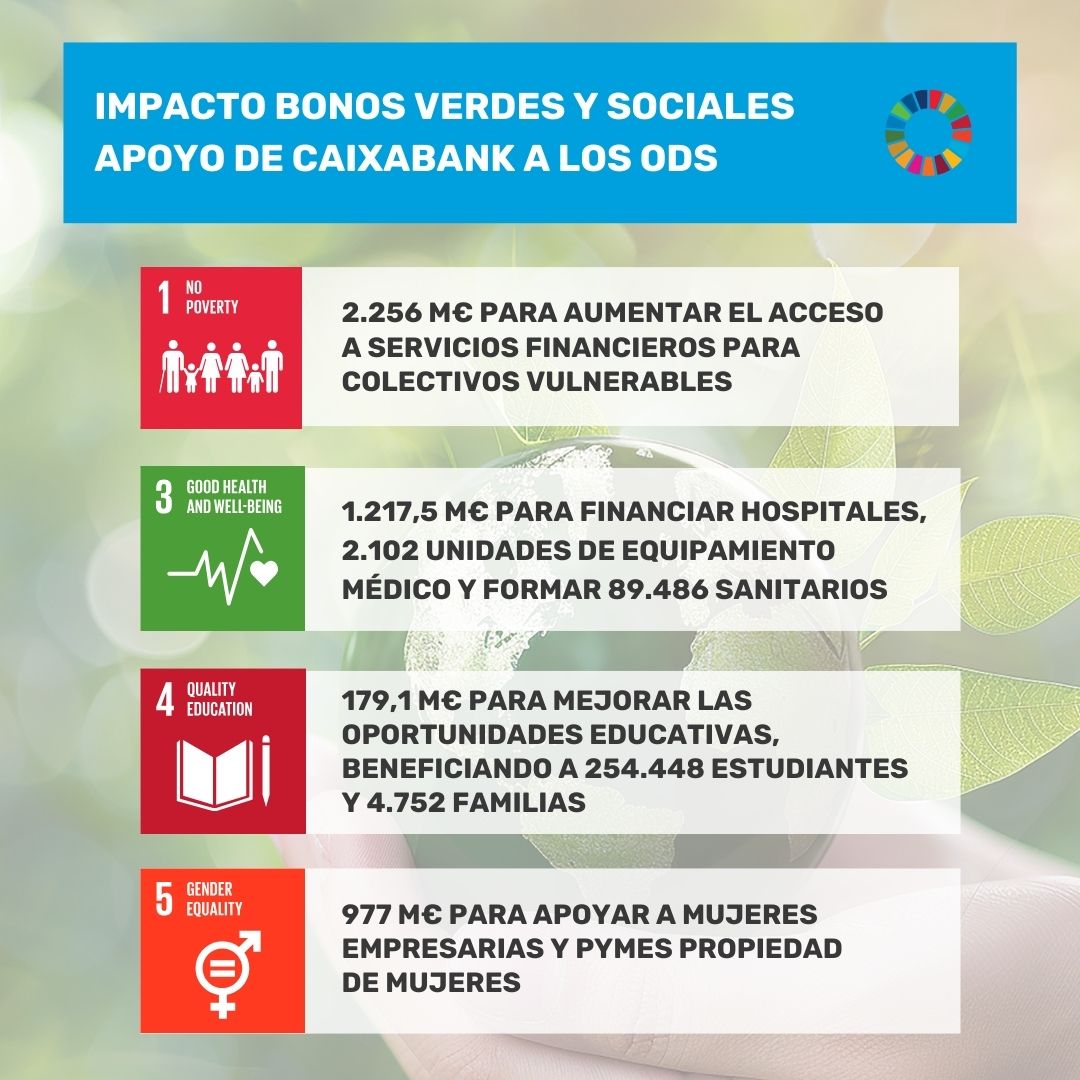 CaixaBank fue el primer banco español en emitir un bono social en apoyo de los ODS de la ONU en septiembre de 2019. Desde entonces, CaixaBank ha emitido de forma recurrente una emisión social al año, mostrando así el compromiso social de la entidad. En total, el nominal colocado en el mercado en formato social alcanza los 6.250 millones de euros.