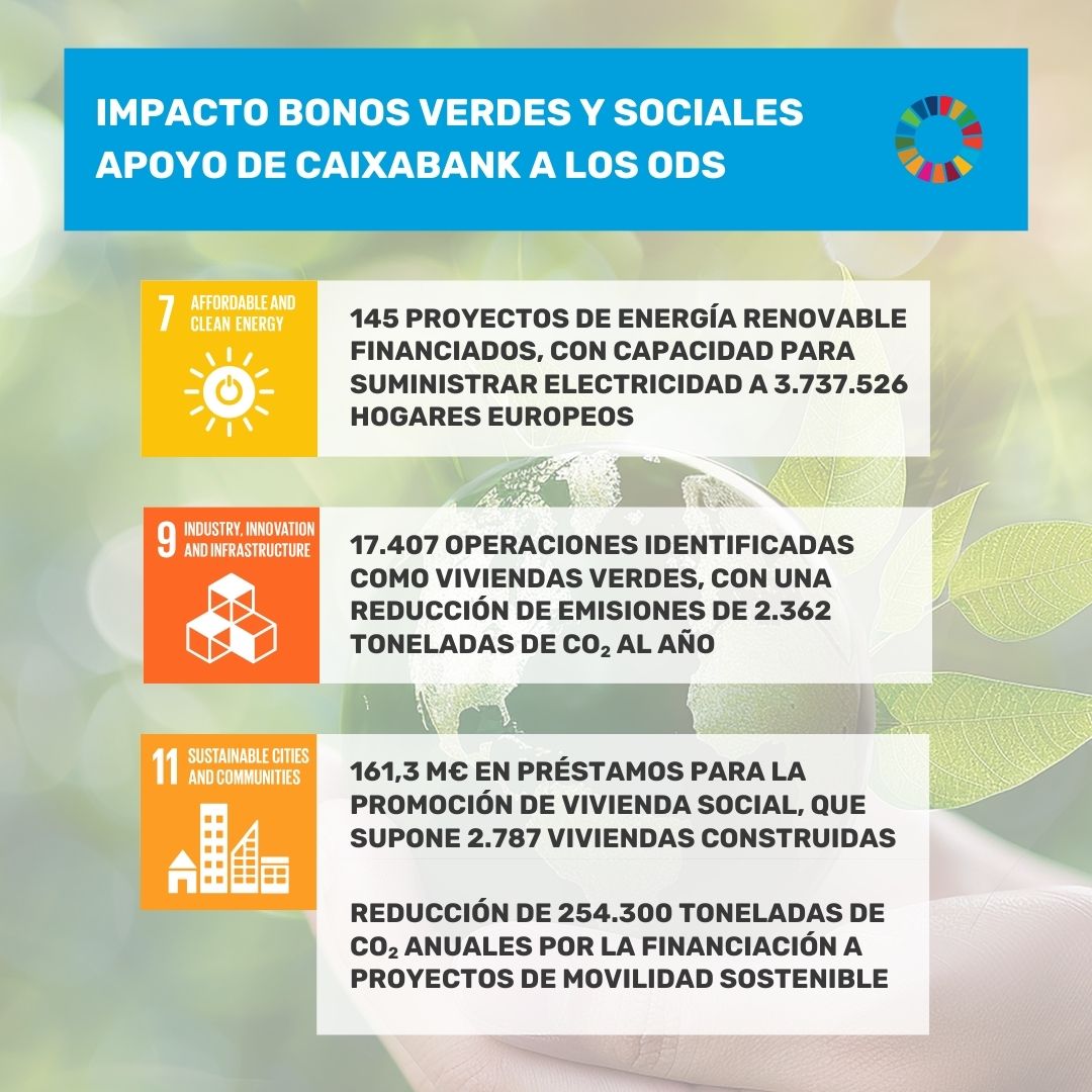 Desde la publicación del marco de emisión de bonos ligados a Objetivos de Desarrollo Sostenible en agosto de 2019, CaixaBank ha reforzado su posición como una de las entidades líderes en Europa en emisiones con criterios ASG, con 15 emisiones propias: 9 bonos verdes y 6 bonos sociales, con un total de 14.380 millones de euros.