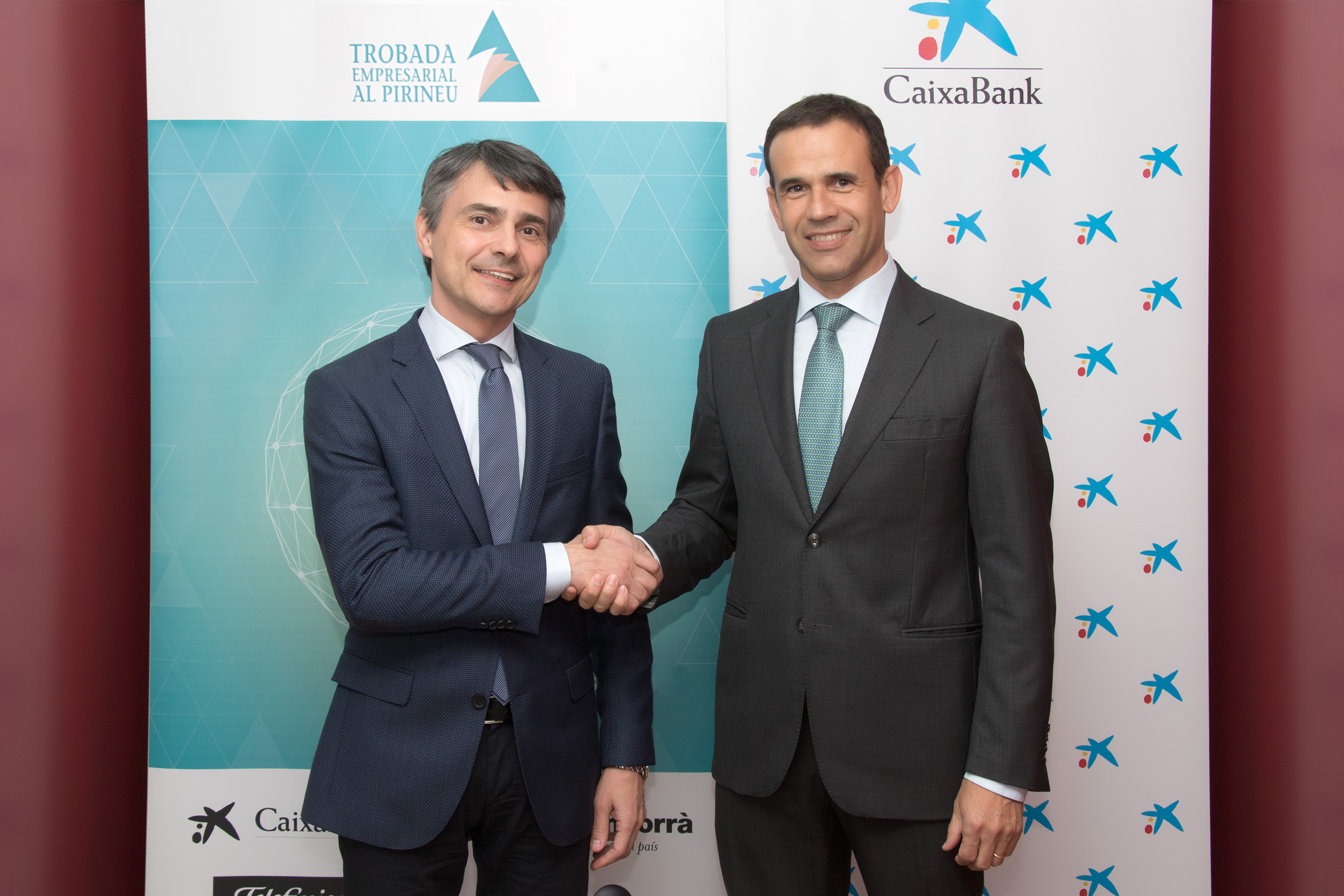 Vicens Voltes, presidente de la Trobada Empresarial al Pirineu, y Jaume Masana, director territorial de CaixaBank en Cataluña, en la firma del acuerdo de colaboración